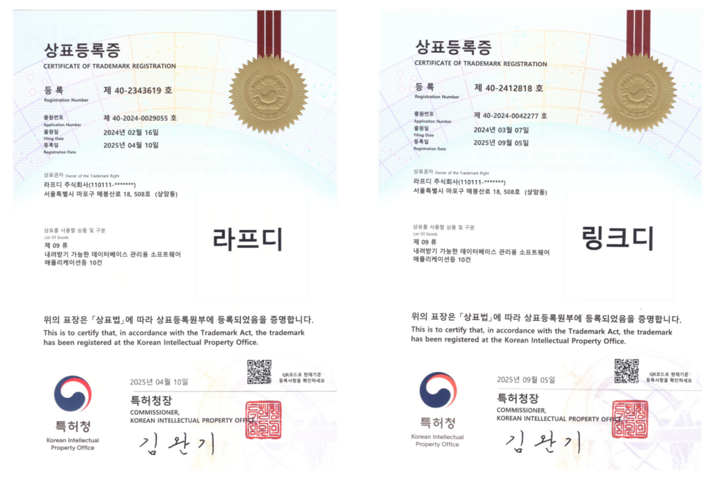 Media 라프디, 링크디 상표권 등록 10월 02, 2025 Published 라프디 주식회사가 ‘라프디’, ‘링크디’ 단어로 상표권 등록을 완료했습니다. 라프디는 라프디 주식회사의 사명이며, 링크디는 라프디 주식회사의 서비스명입니다.지식재산권은 기업에게 중요한 요소이지만, 초기 기업은 놓치기 쉬운 부분입니다. 라프디는 소프트웨어 기업으로서 제품은 물론 지식재산권 확보에도 힘쓰고 있습니다.앞으로 더욱 노력하는 라프디가 되겠습니다.끝.